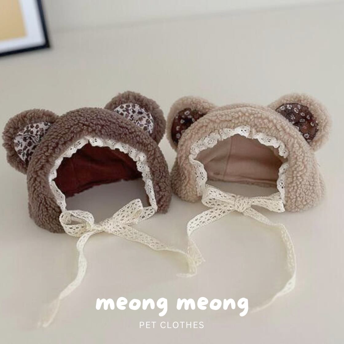 レースのリボンと、くまさんの耳がアクセントになったキュートなフードタイプの帽子♡